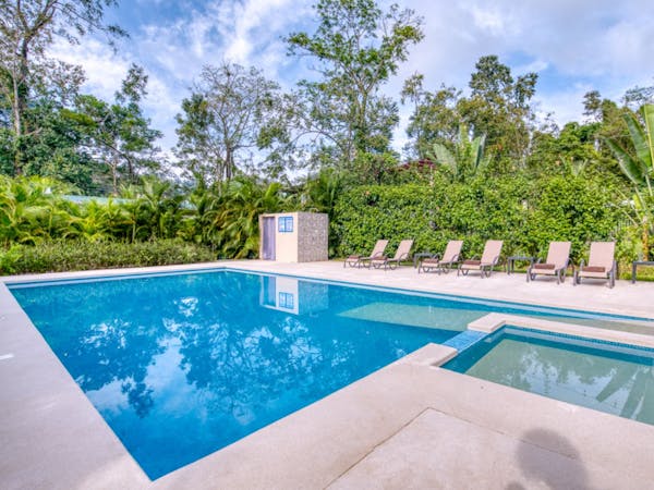 Nuestra impresionante piscina de agua salada ofrece una zona de asientos y sillas, creando el ambiente perfecto para disfrutar del sol y relajarse.